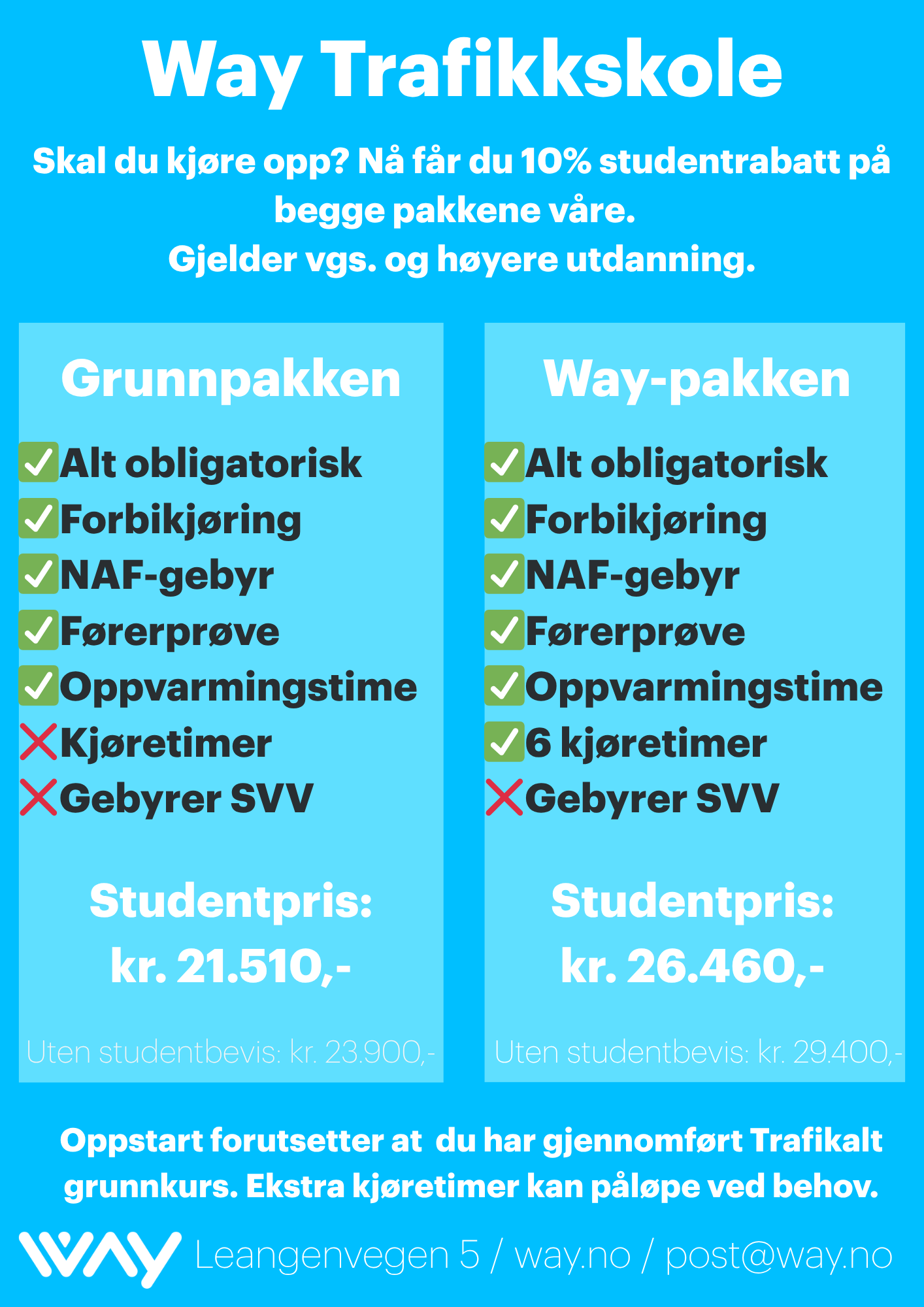 Våre pakker inkluderer all obligatorisk opplæring. Du betaler kun for trafikalt grunnkurs, eventuelle ekstra kjøretimer og gebyrer til Statens vegvesen. Opplæringen tilpasses individuelt, slik at du får akkurat de timene du trenger. På landsbasis ligger gjennomsnittet på ca. 20 ekstra kjøretimer utover den obligatoriske opplæringen, men det er helt vanlig å bruke både færre og flere timer enn dette.