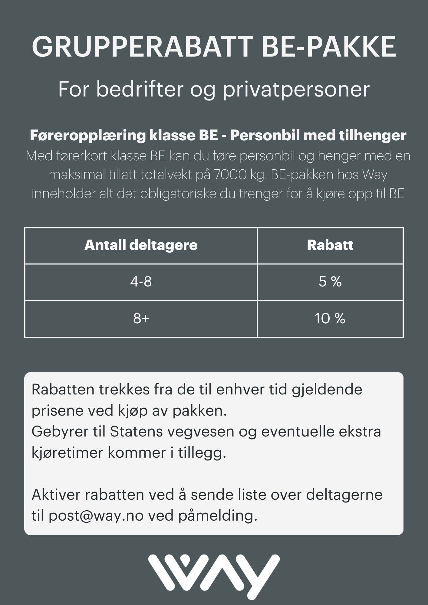 Våre pakker for klasse B, Baut, B96 og BE inkluderer all obligatorisk opplæring. Du betaler kun for eventuelle ekstra kjøretimer og gebyrer til Statens vegvesen. Opplæringen tilpasses individuelt, slik at du får akkurat de timene du trenger. På landsbasis ligger gjennomsnittet på ca. 20 ekstra kjøretimer utover den obligatoriske opplæringen, men det er helt vanlig å bruke både færre og flere timer enn dette.