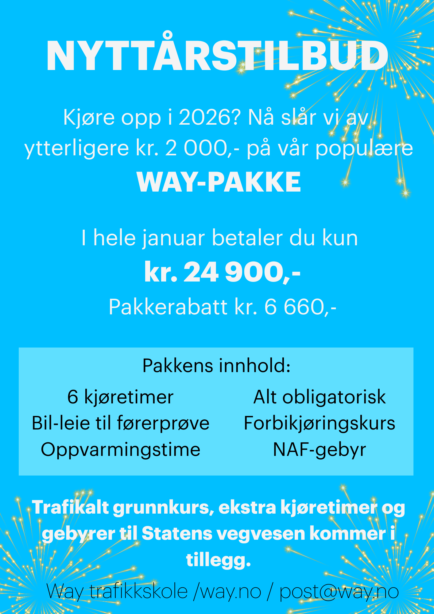 Våre pakker inkluderer all obligatorisk opplæring. Du betaler kun for trafikalt grunnkurs, eventuelle ekstra kjøretimer og gebyrer til Statens vegvesen. Opplæringen tilpasses individuelt, slik at du får akkurat de timene du trenger. På landsbasis ligger gjennomsnittet på ca. 20 ekstra kjøretimer utover den obligatoriske opplæringen, men det er helt vanlig å bruke både færre og flere timer enn dette.