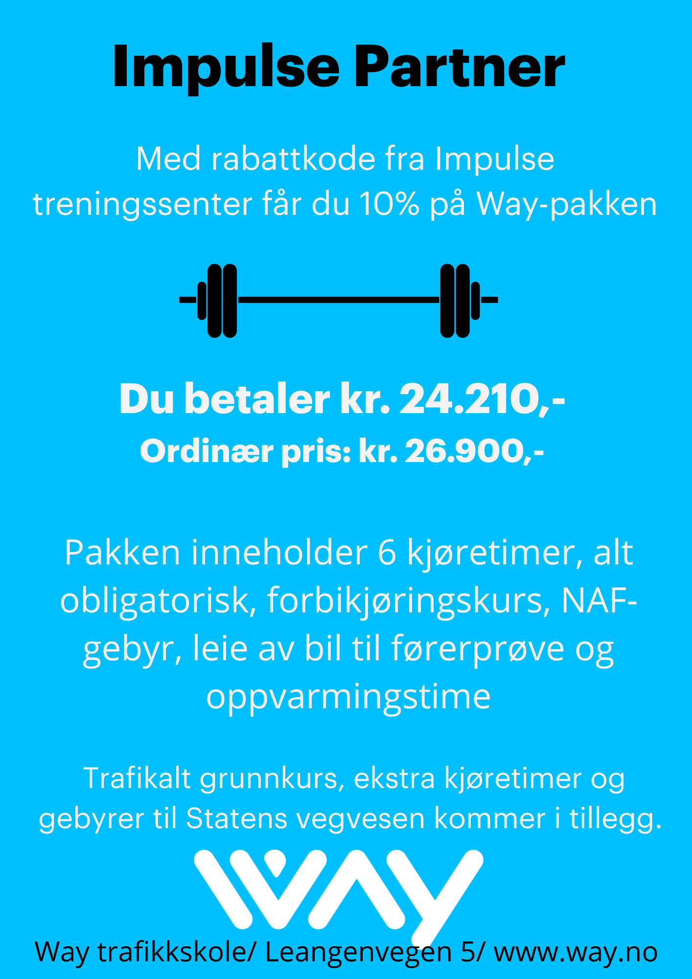 Som Impulse-medlem får du 10 % rabatt på Way-pakken hos Way Trafikkskole.